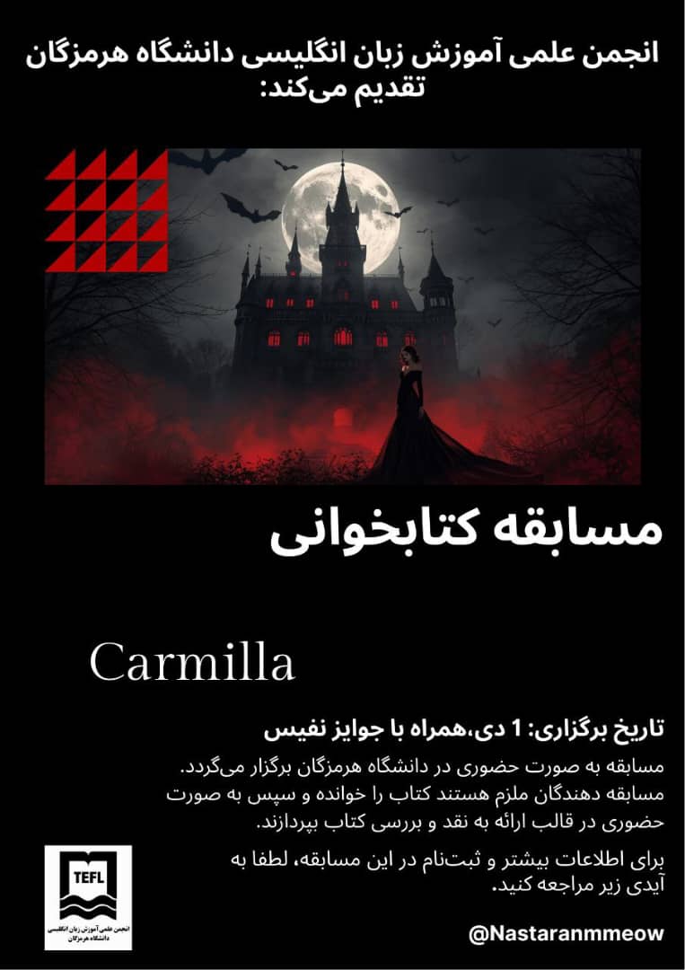 دومین مسابقه کتابخوانی به زبان انگلیسی با محوریت نقد و بررسی کتاب Carmilla، اول دی‌ماه به‌صورت حضوری در دانشگاه هرمزگان برگزار می‌شود. این رقابت با هدف تقویت مهارت‌های زبانی و ارائه علمی، همراه با جوایز نقدی برای برگزیدگان برگزار خواهد شد.