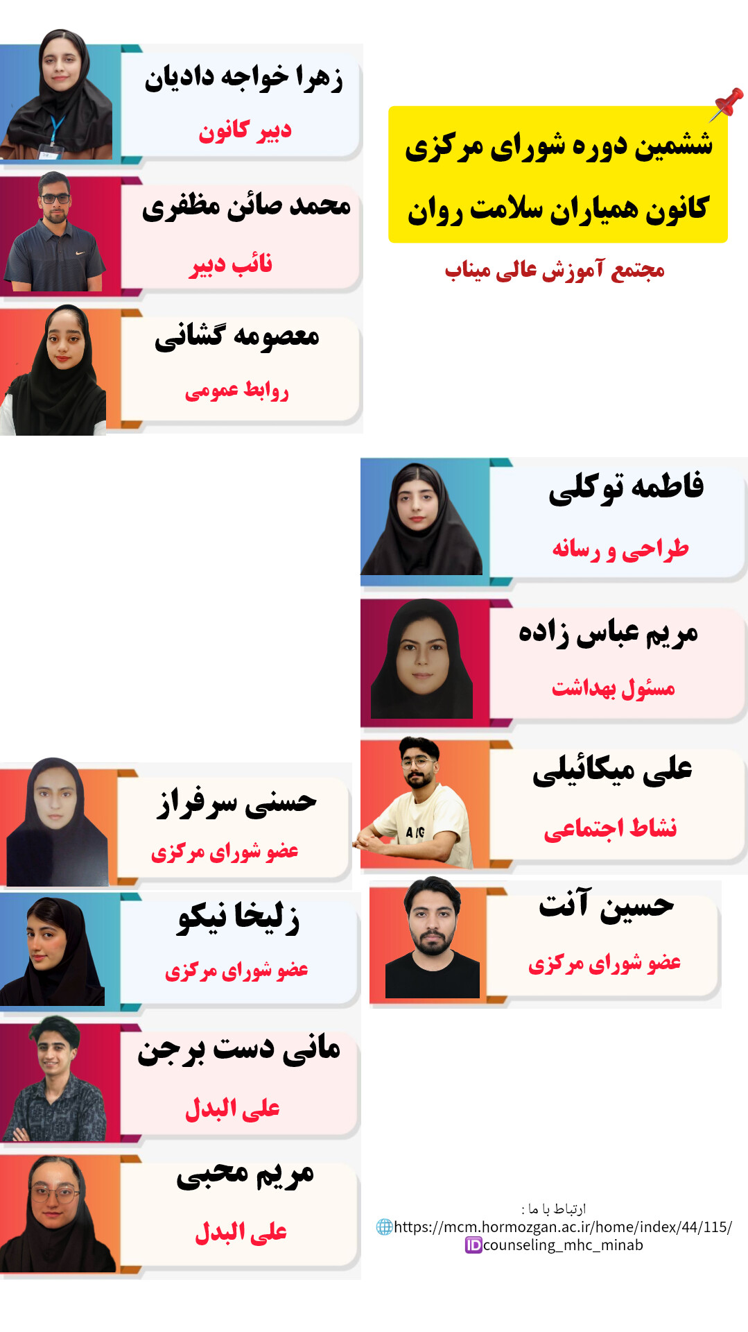 دانشجويان به عنوان اصحاب فكر و انديشه از سرمايه‌هاي ناب هر جامعه‌ای به شمار مي‌روند و نقش ارزنده و اهميت بي بديل آن‌ها بر هيچكس پوشيده نيست. ششمین دوره شوراي مركزي كانون همياران اين مجتمع دانشگاهی که در هويت‌بخشي به فعاليت‌هاي داوطلبانه، آگاهی بخشی به فعالیت های مرکز مشاوره و سلامت ٬ به فعالیت می‌پردازند به حضور پر مهرتان معرفی می‌گردند. اميد است با وجود چنين دانشجويان مستعد و با انگيزه شاهد رشد و شكوفايى توانمندي‌های هر چه بيشتر آنان و ايجاد یک محیط دانشگاهي با نشاط  و پویا باشيم.