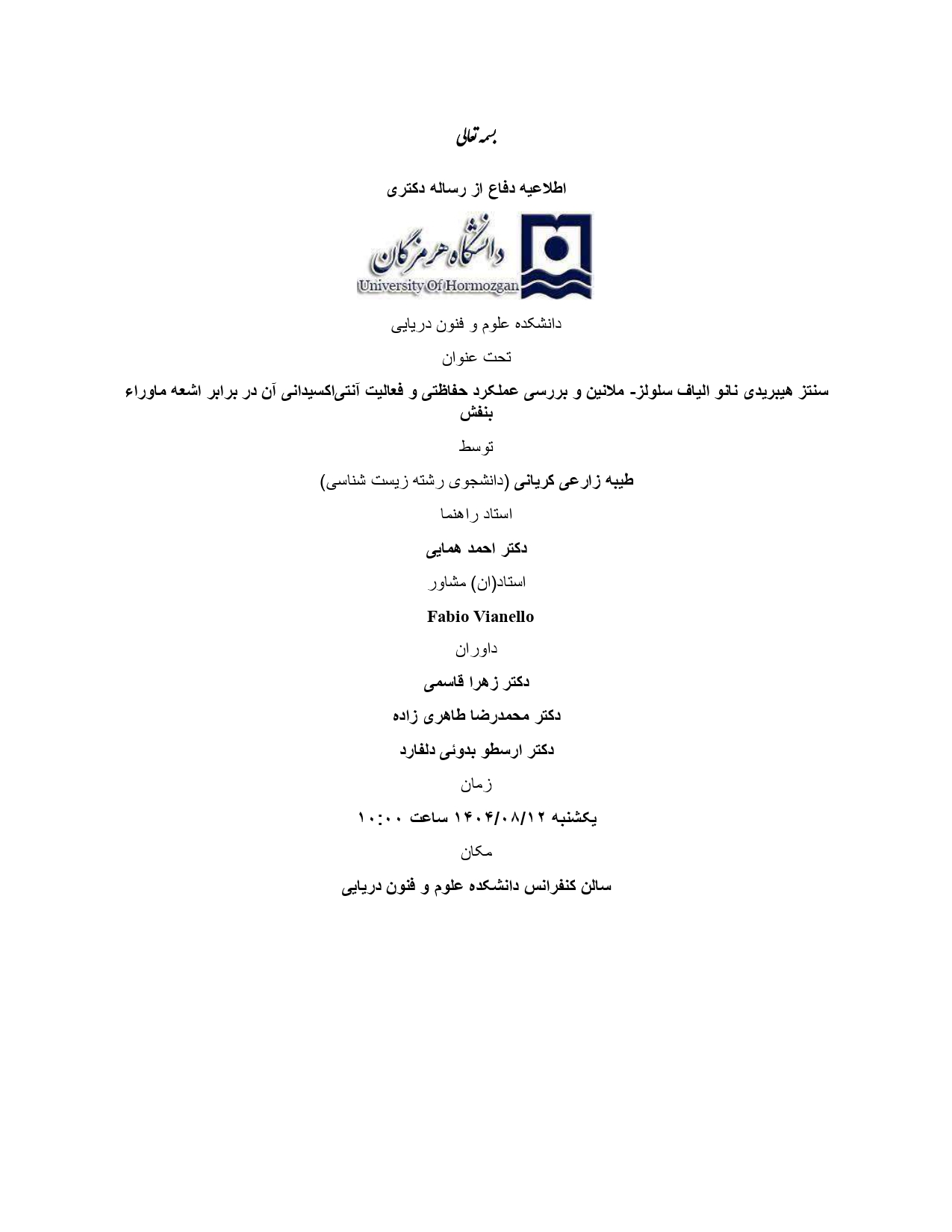 اطلاعیه دفاع از رساله دکتری خانم طیبه زارعی کریانی